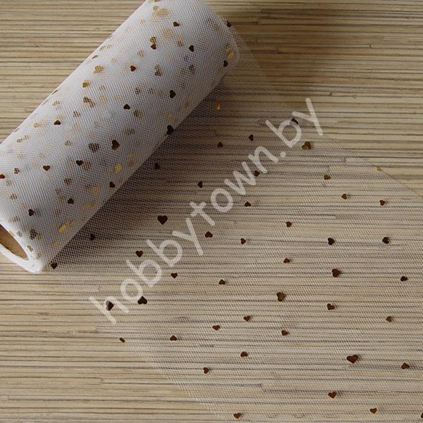 Фатин средней жёсткости с пайетками Сердечки , ширина 15 см (цв.белый/золото) 1 метр