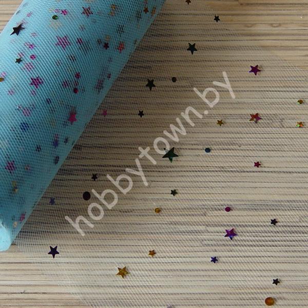 Фатин средней жёсткости с пайетками Звёздочки, ширина 15 см (цв.голубой 27) 1 метр