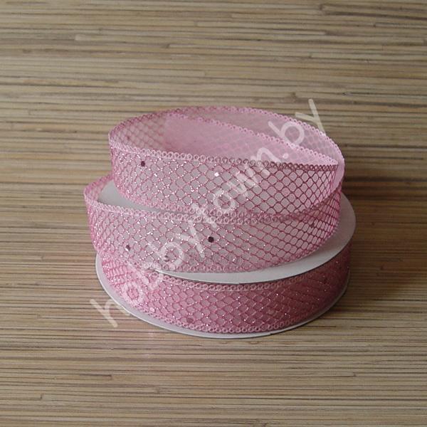 Лента декоративная с сеточкой и блёстками 25 мм (цв. розовый) 1 м