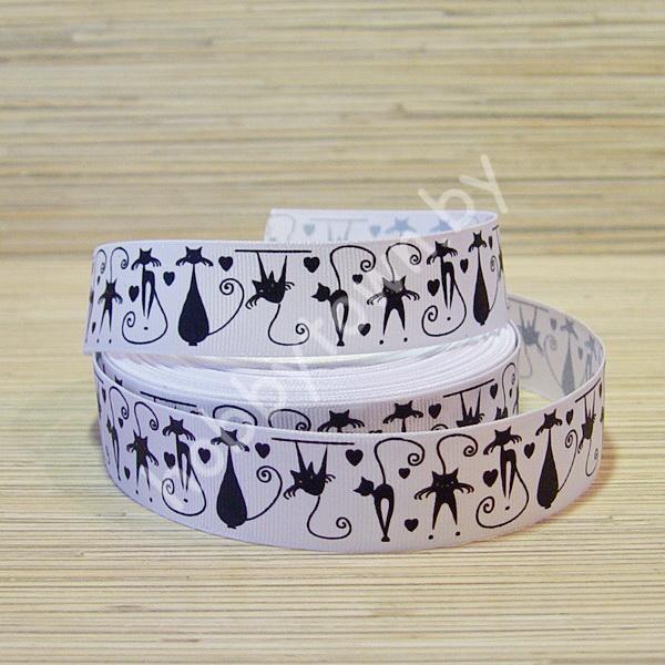 Лента репсовая 2,5см “Кошки” (цв. белый с чёрным) 1м