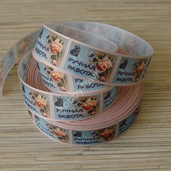 Лента репсовая 25 мм с рисунком Ручная работа (цв. серо-голубой с цветком) 1 м