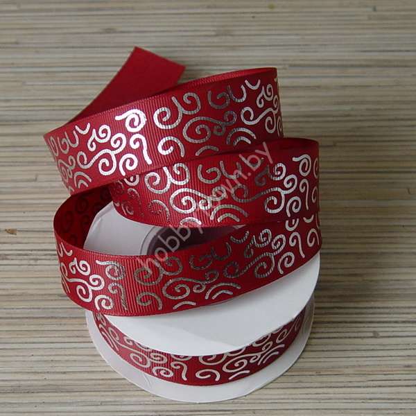 Лента репсовая 25 мм Завитки (цв. бордовый/серебро 37) 1м