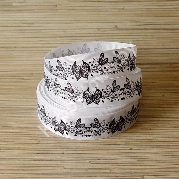 Лента репсовая 25мм «Бабочки» (цв. белый-чёрный) 1м