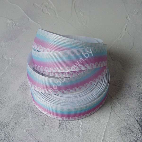 Лента репсовая с рисунком Кружево по краям, 25 мм (цв. розово-голубой) 1 м