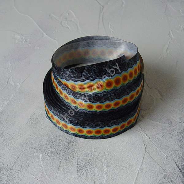 Лента репсовая с рисунком Подсолнухи на кружеве, 25 мм (цв. чёрный) 1 м