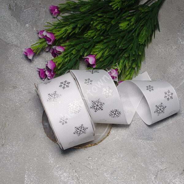 Лента репсовая с рисунком Снежинки 40 мм (цв. белый/серебро) 1 м
