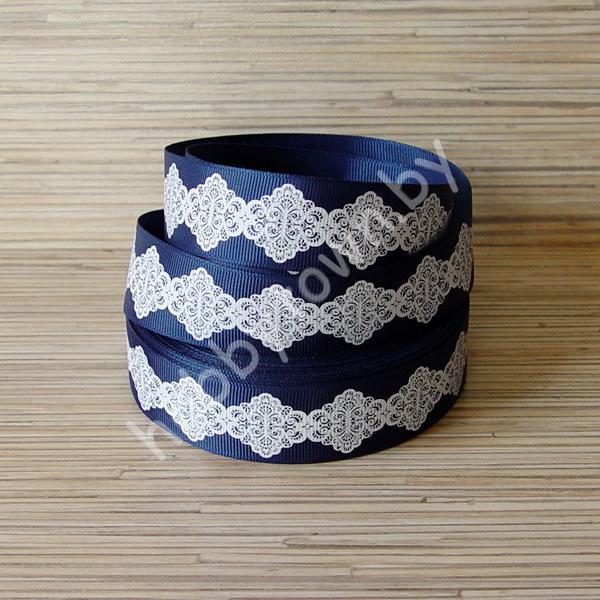 Репсовая лента с рисунком “Кружевной ромб” 25 мм (цв.синий/с белым) 1 метр