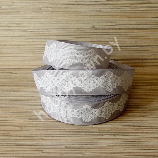 Репсовая лента с рисунком “Кружевной ромб” 25 мм (цв.св-серый/с белым) 1 метр